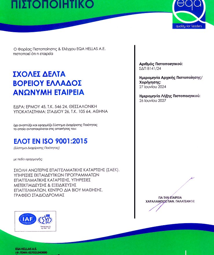 Ως σύγχρονος και καινοτόμος οργανισμός, ο Εκπαιδευτικός Όμιλος ΔΕΛΤΑ 360 έχει λάβει πιστοποιήσεις ISO 9001:2015 και ISO 27001:2022.